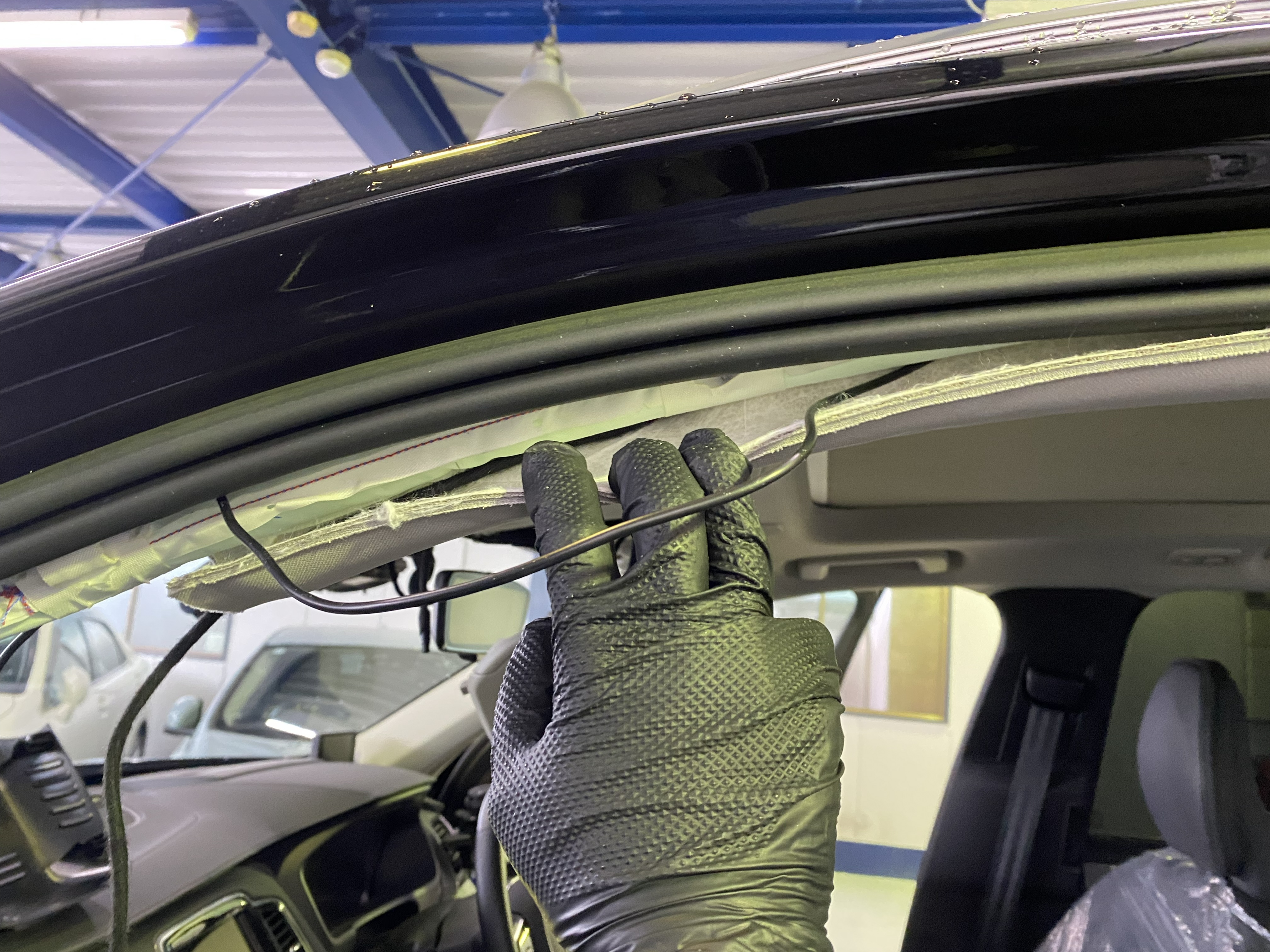 私が手でルーフトリムを少し下に引っ張って撮影しています。
